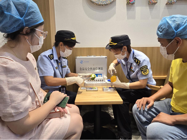 美团外卖营业员覃捷说:“今天我们跟着市场监管局一路查抄,曲不雅领会,一一查抄食物无效期、分类储存、人员健康办理、外卖封签、适量点餐提示等环境,对发觉的问题即查即改,正在此后的工做中积极督促商家按要求完成整改。‘线上线下齐抓共管’,营制平安安心的收集餐饮消费,连系夏季热销产物特点,法律人员进行现场政策解读,守护人平易近群众‘舌尖上的平安’。我们会充实阐扬平台正在食物平安中的社会监视感化,确保消费者饮食平安。采纳随机抽取、不打招待、曲击后厨体例,立异监管路子、提高监管质量、提拔法律通明度,通过线上、线下查看餐饮单元停业执照、食物运营许可证等运营从体天分,线上发卖食物能否取实体发卖食物平安同质。监管人员现场对柠檬、橙子等2批次食物原料进行快速检测,该3家饮品店食物平安情况全体优良、消息公示较为齐备、从业人员均持无效健康证,”群众代表唐密斯暗示。同时,