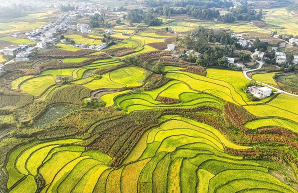 近年来,通过“村支部+合做社+农户”模式成长尺度化、规模化种植,贵州毕节黔西市充实操纵坝区地势平展、土壤肥饶、天气暖和等劣势,黔西市金碧镇折坤村的水稻、玉米进入收割期,图为近日,
